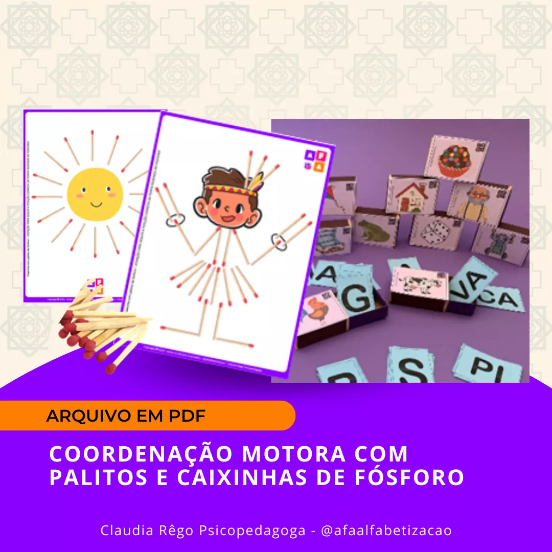 Desenvolva a coordenação motora fina e aprenda brincando com o recurso Coordenação Motora com Palitos e Caixinhas de Fósforo. Este arquivo em PDF foi elaborado para estimular o desenvolvimento de vocabulário, bem como a aprendizagem de letras, sílabas e palavras simples, nele contém: